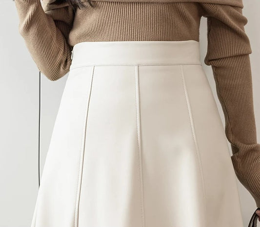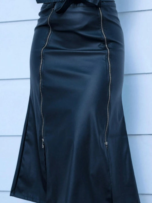 Saia de Couro Midi Trapézio Fivela Cintura Alta