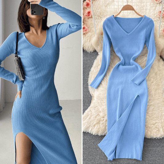 Vestido Tubinho Midi C/ Fenda Manga Longa Tricô