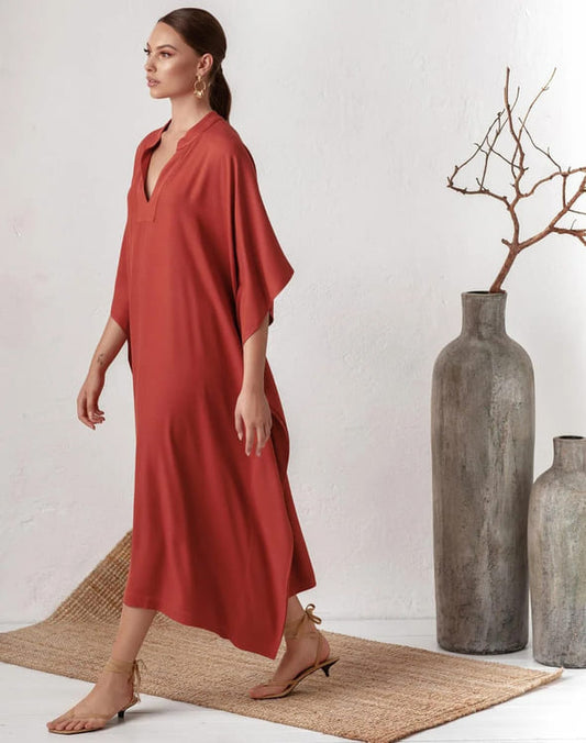 Vestido Longo Solto Decote Bordado Marrocos Túnica