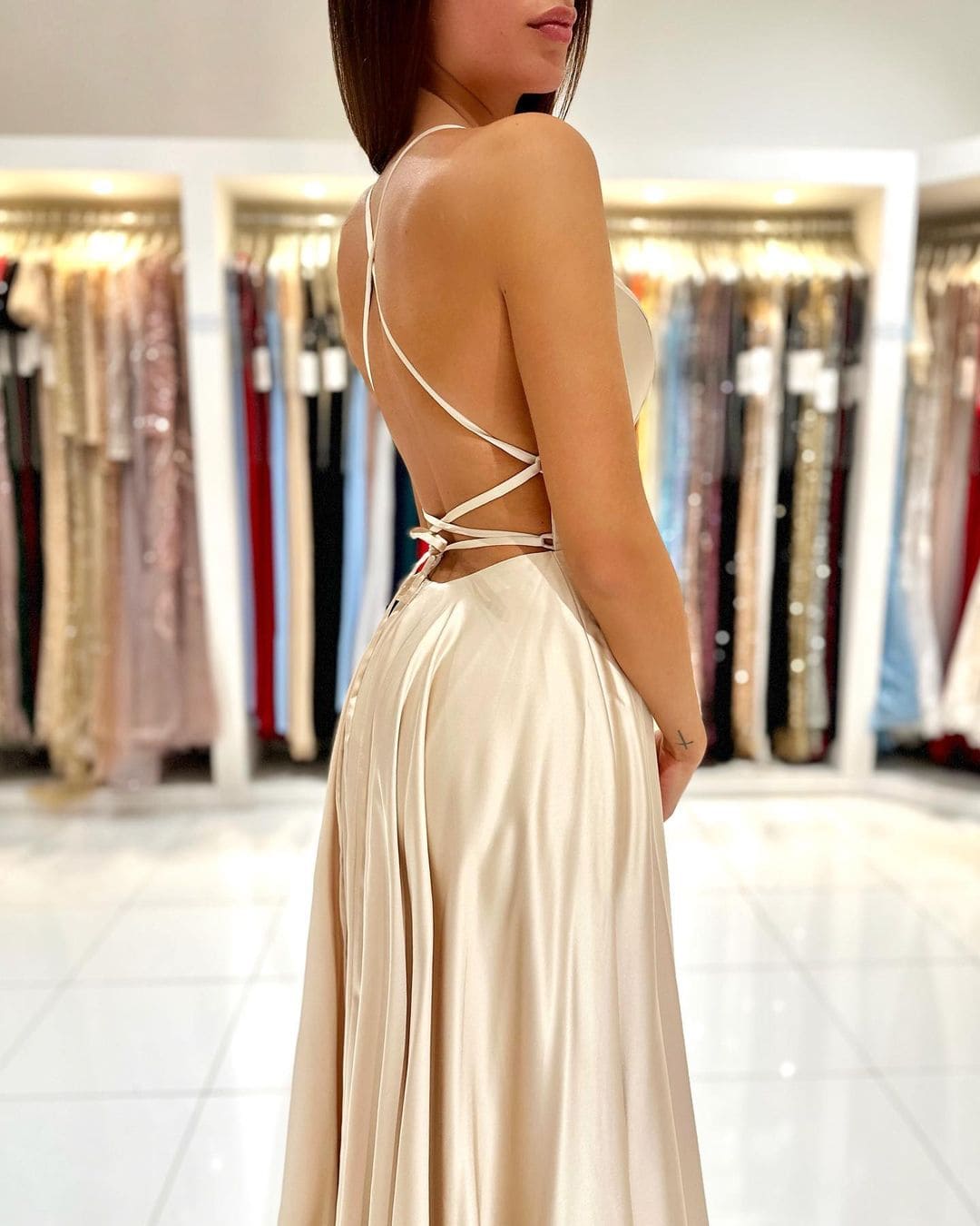 Feito em cetim de alta qualidade, este vestido possui um corte acinturado que valoriza a silhueta feminina. A saia é elegante e possui fenda alta, adicionando um toque de sensualidade ao visual. As costas nuas são um detalhe encantador, e as amarrações de alcinha fina adicionam um charme extra.