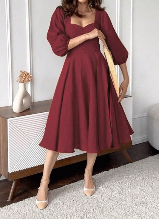 Vestido Retrô Midi Vintage Manga Princesa Decote Coração