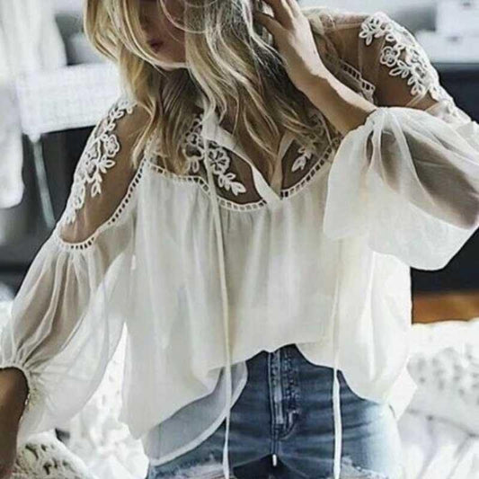 Camisa de Lese c/ Vazado Floral Manga Lanterna
