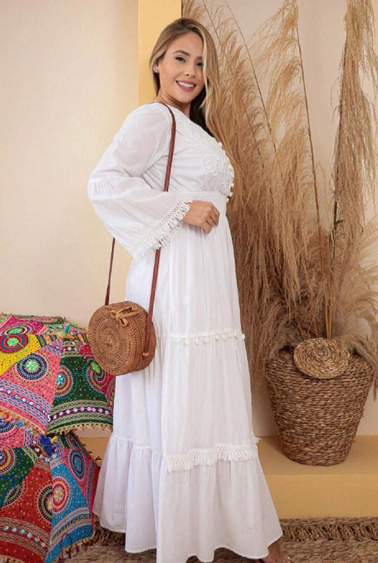 Vestido Longo Branco c/Renda Boho Manga Curta