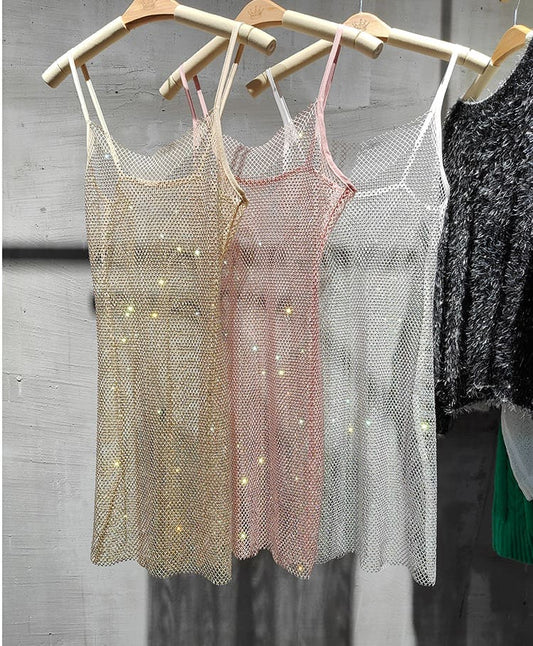 Vestido de Festa Brilhoso Rede de Cristais Alça Fina