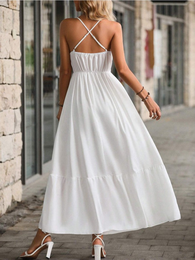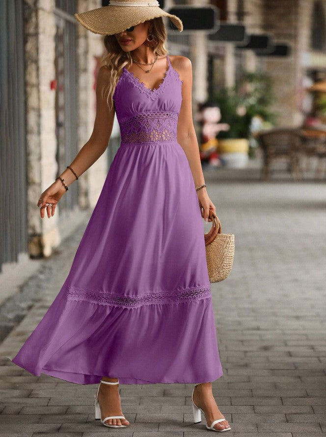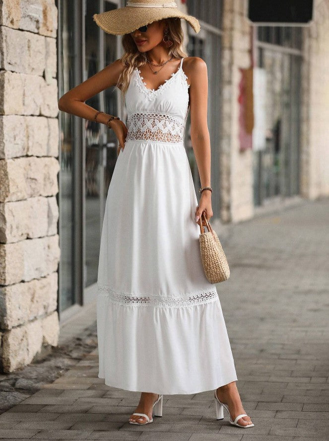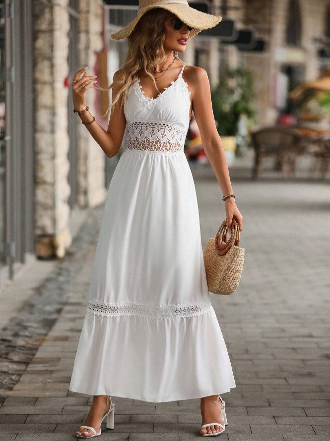 Lindo vestido longo com detalhes em renda na cintura e na saia de alça fina. Feito em tecido leve e fluido. Perfeito para os dias mais quentes de verão como look casual ou de festa por seu acabamento delicado.