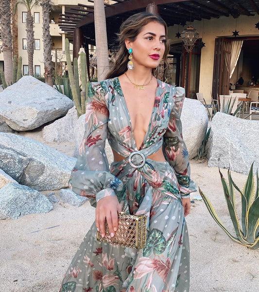 Vestido Longo Vazado Amarrações Decote Profundo Estampado