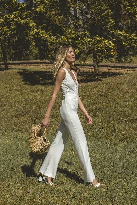 Os macacões com decote em V são uma escolha clássica e elegante. Combine com sapatos de salto e acessórios discretos para um visual sofisticado.