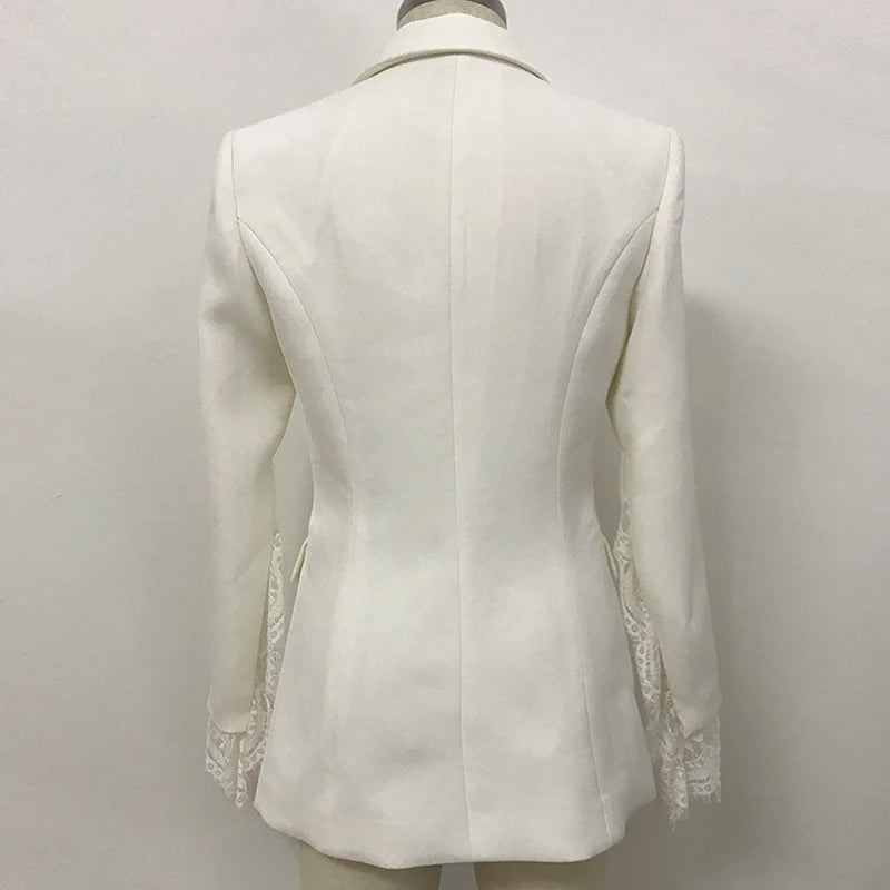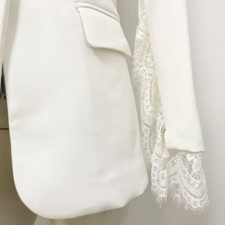 Elegante blazer longo com corte alfaiataria, gola inglesa e um botão na frente. Modelo possui bolsos laterais. Maior charme do blazer está na renda no decote e nas mangas, que dá um estilo mais requintado ao look office. Feito em tecido mais leve com forro em cetim.