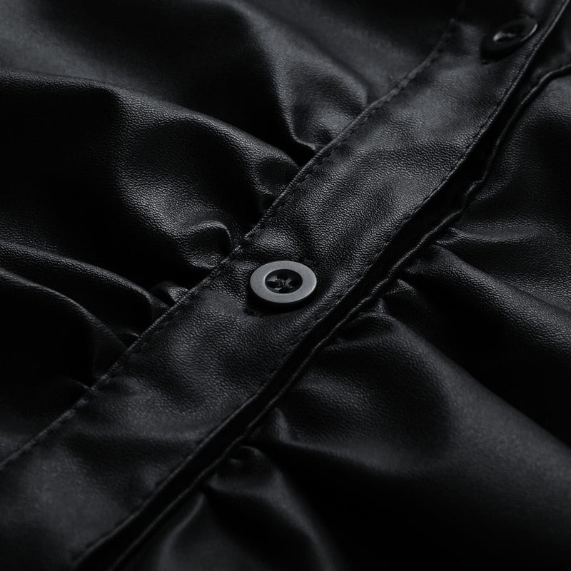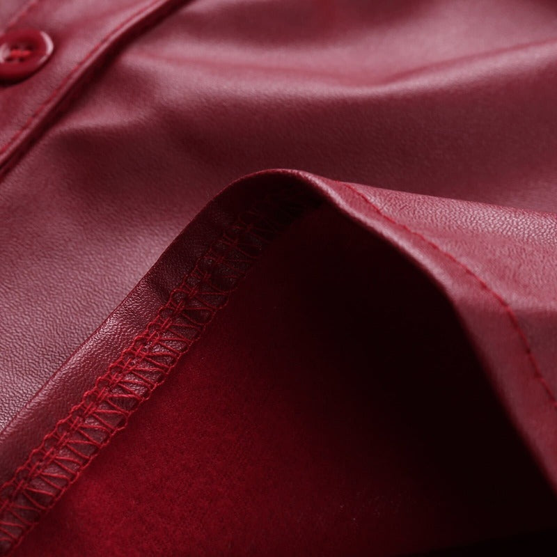Linda camisa social de couro ecológico, com botões frontais, gola em V, que pode ser controlada pelos botões, podendo virar decote profundo. Manga longa com abotoados. O charme do modelo fica por conta do franzido na parte da cintura, ajudando esconder as gordurinhas.