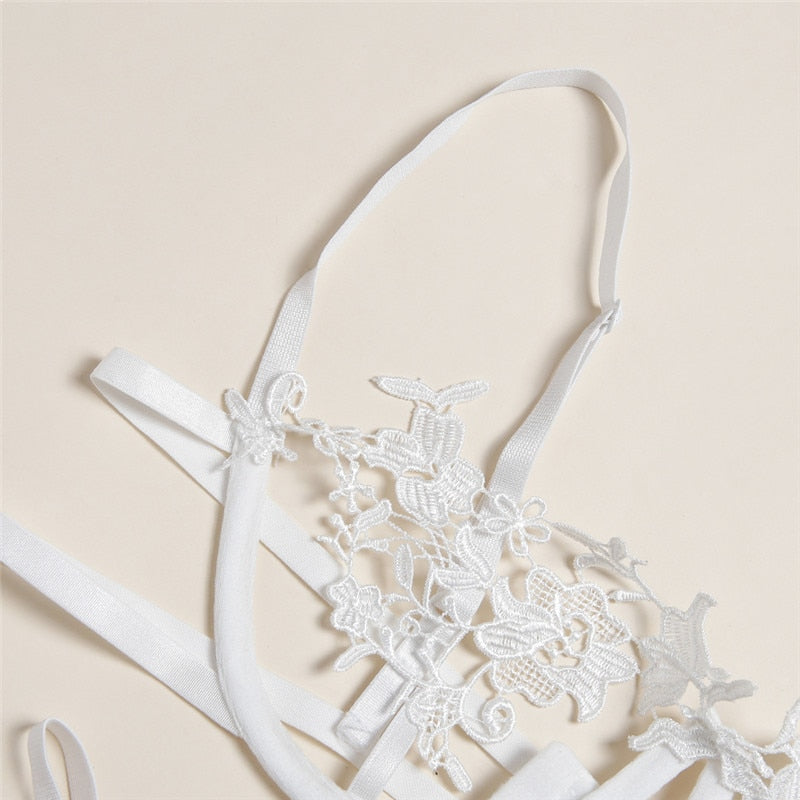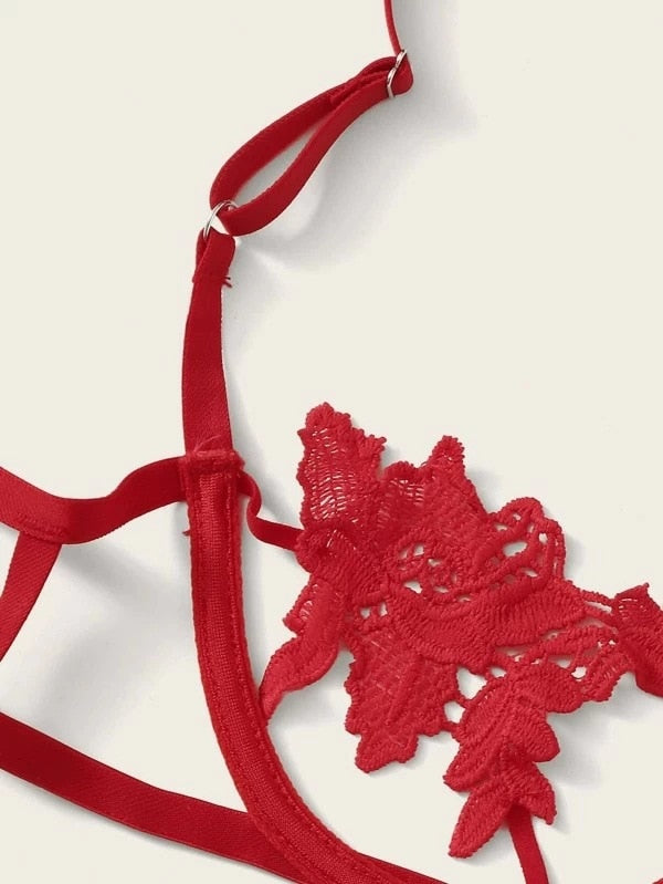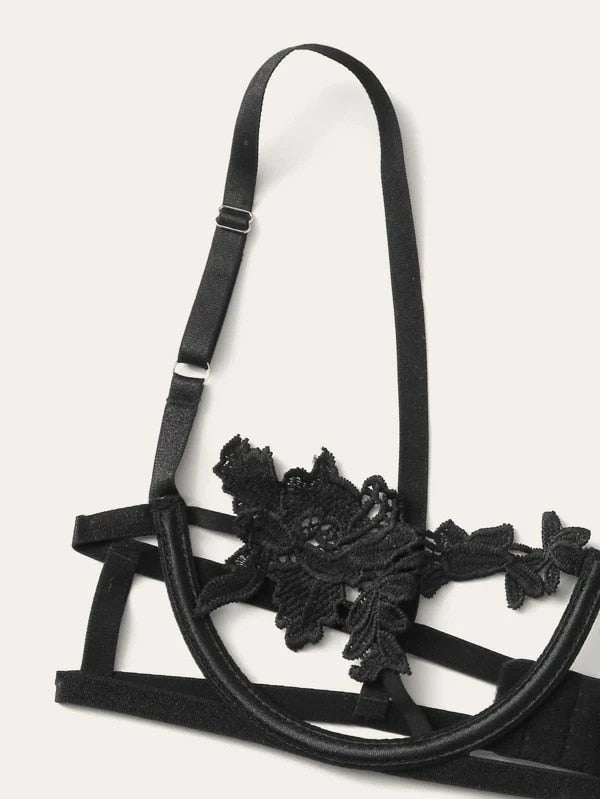 Lindo Conjunto Lingerie de Renda com sutiã vazado erótico e calcinha com tiras corte fio dental. O charme especial do modelo fica por conta do bordado floral do sutiã. Look exuberante para as noites apimentadas.