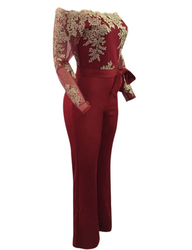 Macacão Ombro a Ombro de manga longa com blusa em renda. Modelo chique, perfeito para festas no inverno. Com renda na cor do fundo e renda dourada.