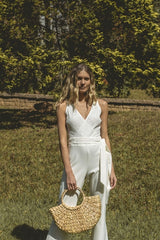 Lindíssimo macacão feminino branco com blusa de renda com forro, decote v e cinto. Costas com renda transparente trás um charme especial ao modelo. Sofisticado look office ou casual. Acabamento de alta qualidade.