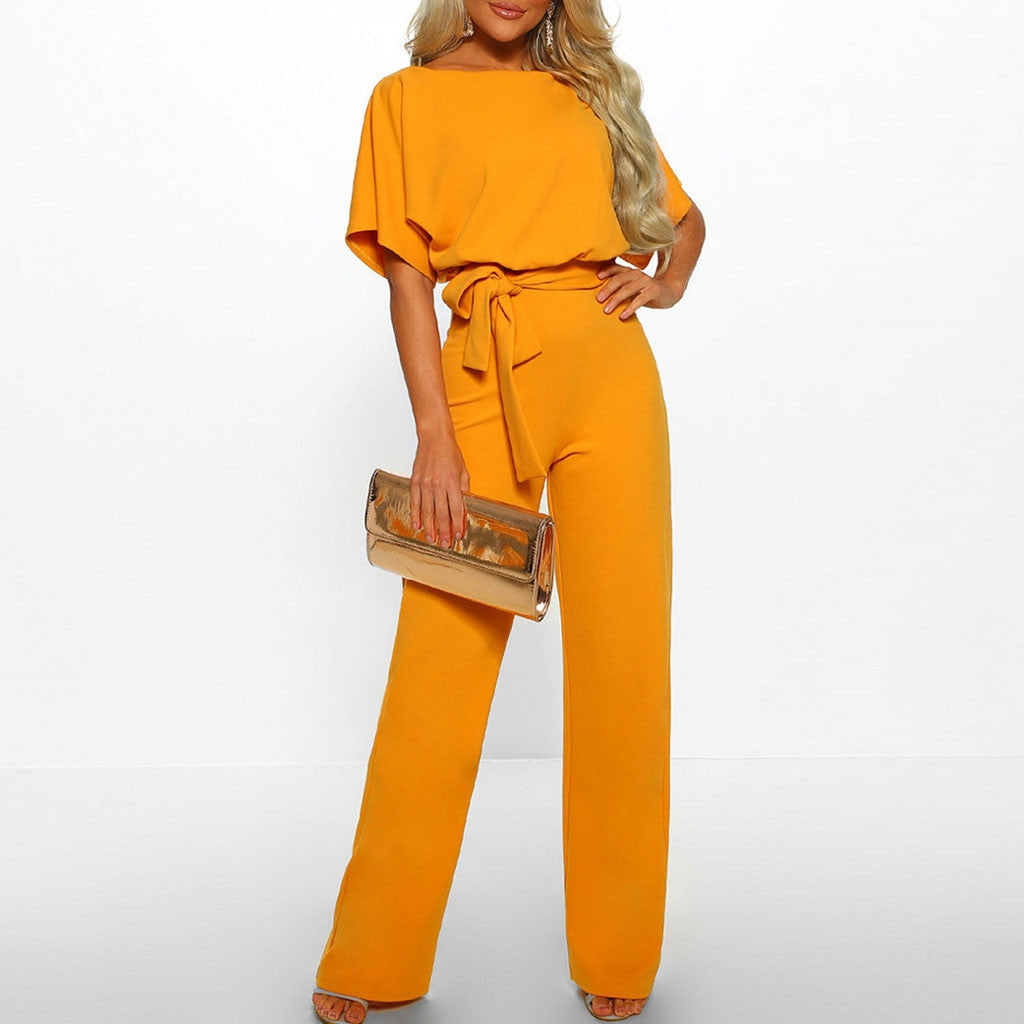 Elegante macacão social feminino de manga curta, acinturado, com faixa na cintura e calça de corte reto. Ótimo look office, passeio e casual.