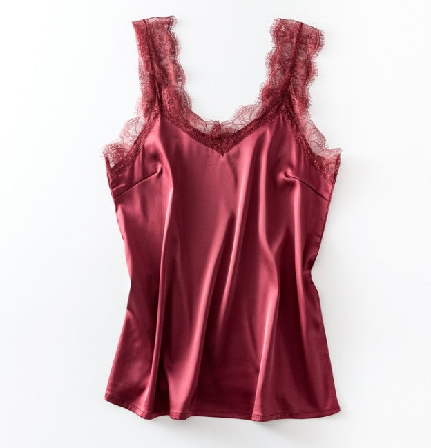 Lindíssima Regata de Cetim com Renda no decote e na borda de alça fina. Fino acabamento de cetim de seda com toque macio e caimento fluido. Look perfeito casual ou de festa.