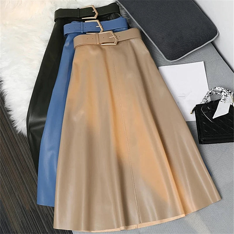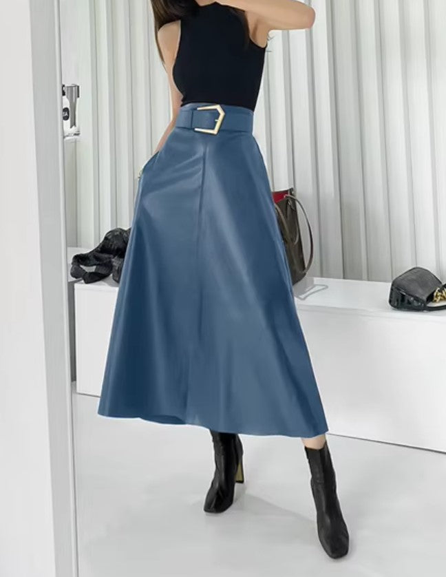 Saia de Couro Midi Trapézio Fivela Cintura Alta
