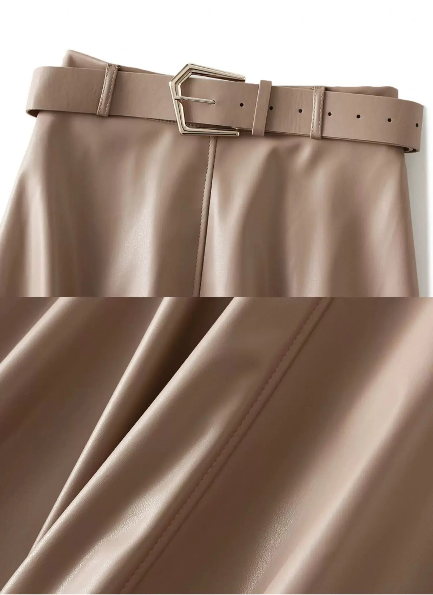 Eleve o seu estilo com a Saia de Couro Midi Trapézio. Feita com couro ecológico de alta qualidade, possui uma elegante fivela no cinto e corte trapézio evasê que valorizam a silhueta. Com cintura alta, essa saia é perfeita para compor looks sofisticados e exclusivos. Seja única, seja luxo. A saia de couro possui zíper na parte de trás para o ajuste perfeito.