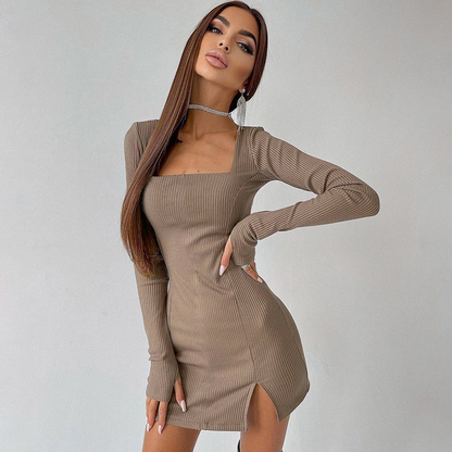 Vestido Curto Sexy Canelado Manga Longa Fenda