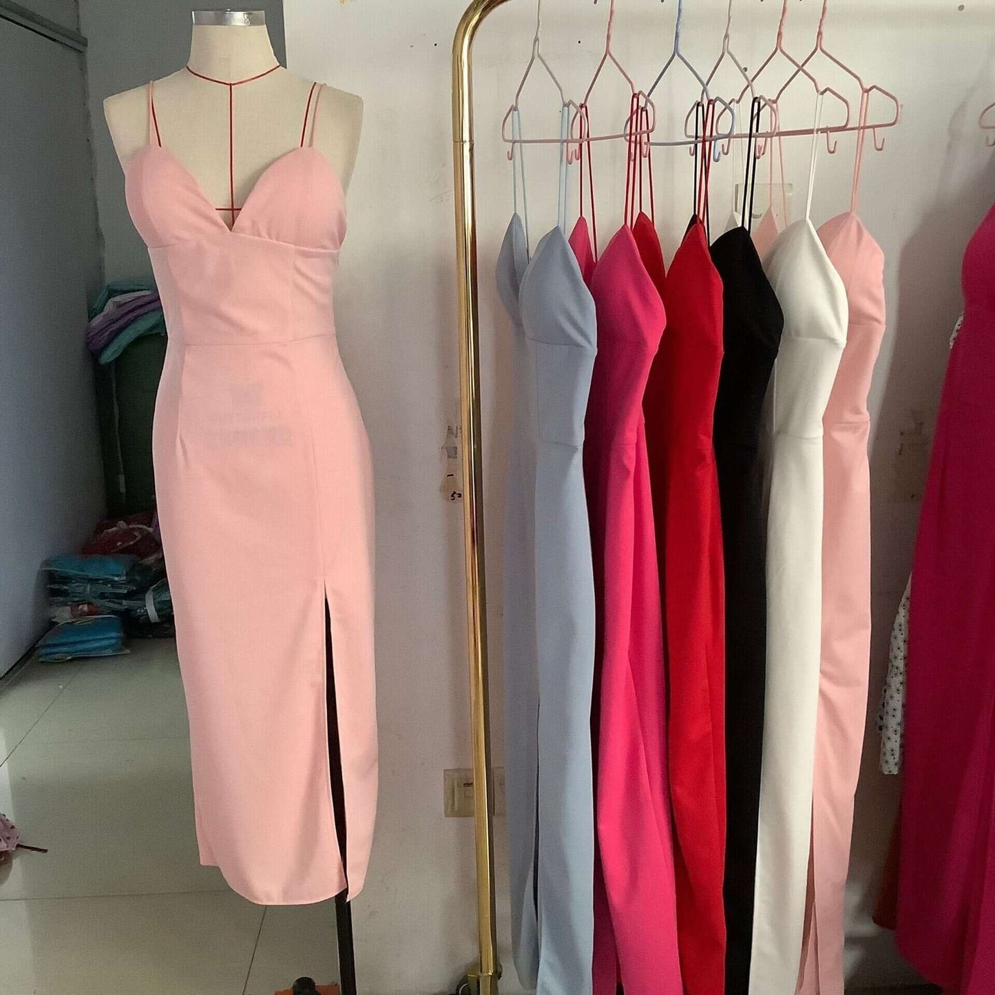 Clássico vestido de festa tubinho midi. Com alças fininhas e uma linda fenda lateral, essa peça maravilhosa e super sensual também conta com corte bem acinturado, decote V profundo e costas nuas. Várias opções de cores: branco, rosa claro, vermelho, rosa pink barbicore), verde petróleo, azul royal, cinza e preto.