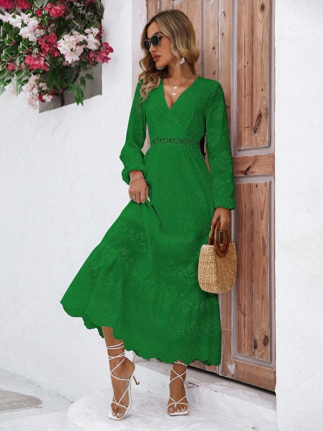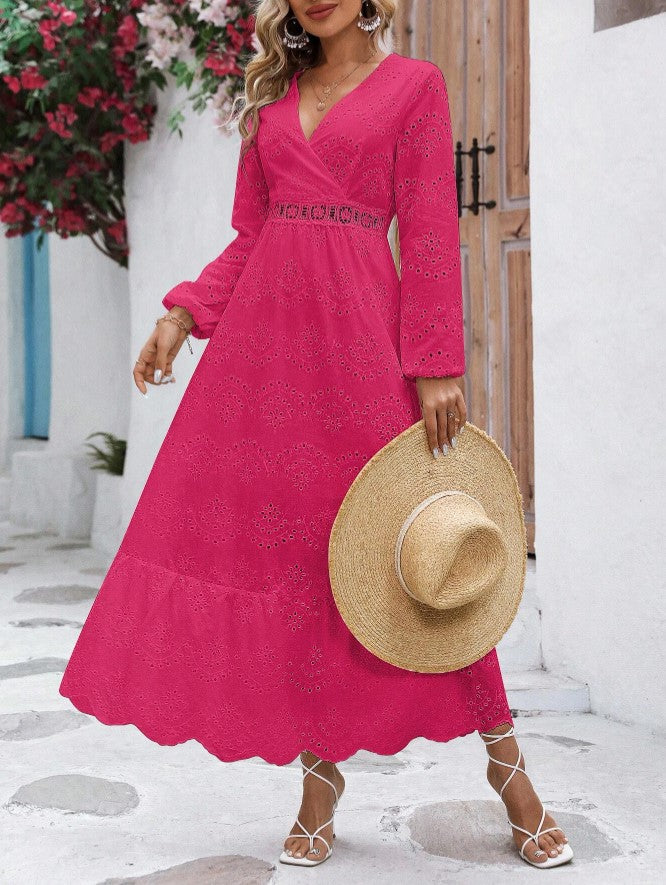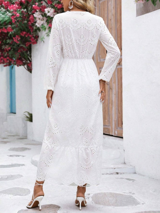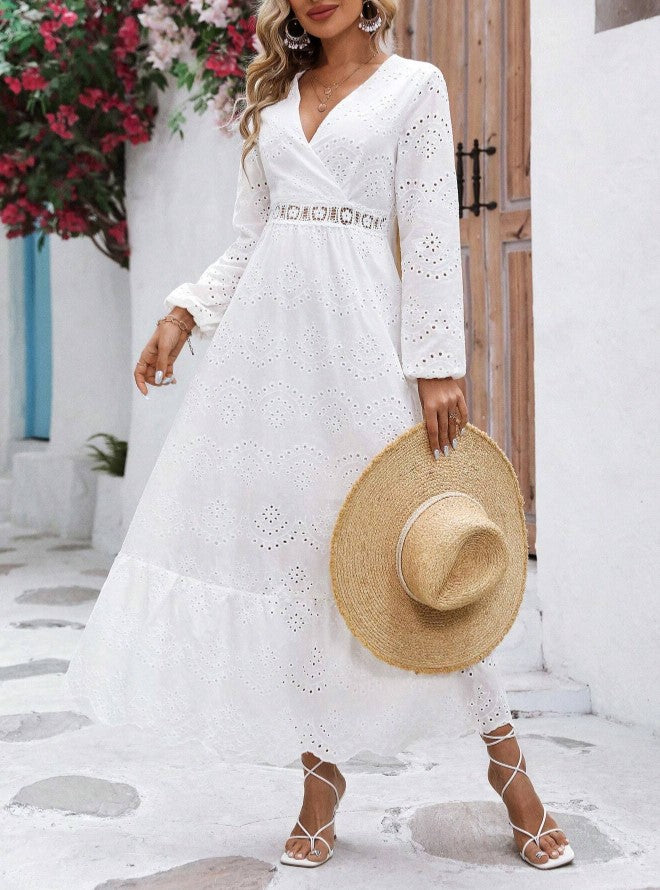 Elegante vestido longo de manga longa feito em renda lese ou laise. O lese, tecido vazado e bordado de algodão fino está bem em alta, proporcionando conforto e refinamento. Decote em V e cintura com leves transparências trazem sofisticação ao look casual ou social. Modelo flerta com estilo boho chic, e pode ser usado até como vestido de escritório.