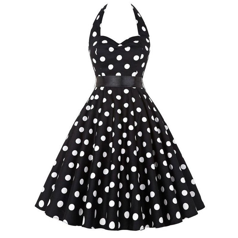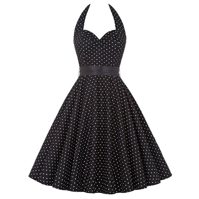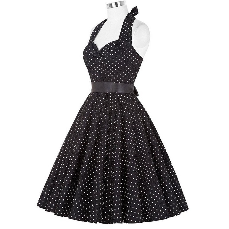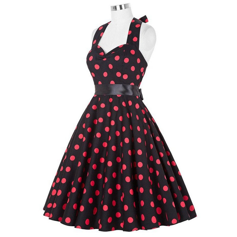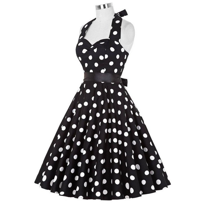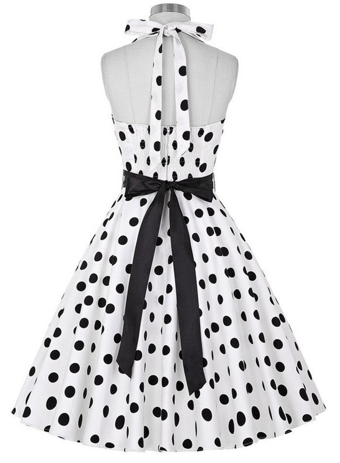 Lindos Vestidos Vintage altura Midi com corte da saia rodado / godê sem manga na estampa bolinha. O charme fica por conta da cintura marcada com fita em cetim e costas nuas.